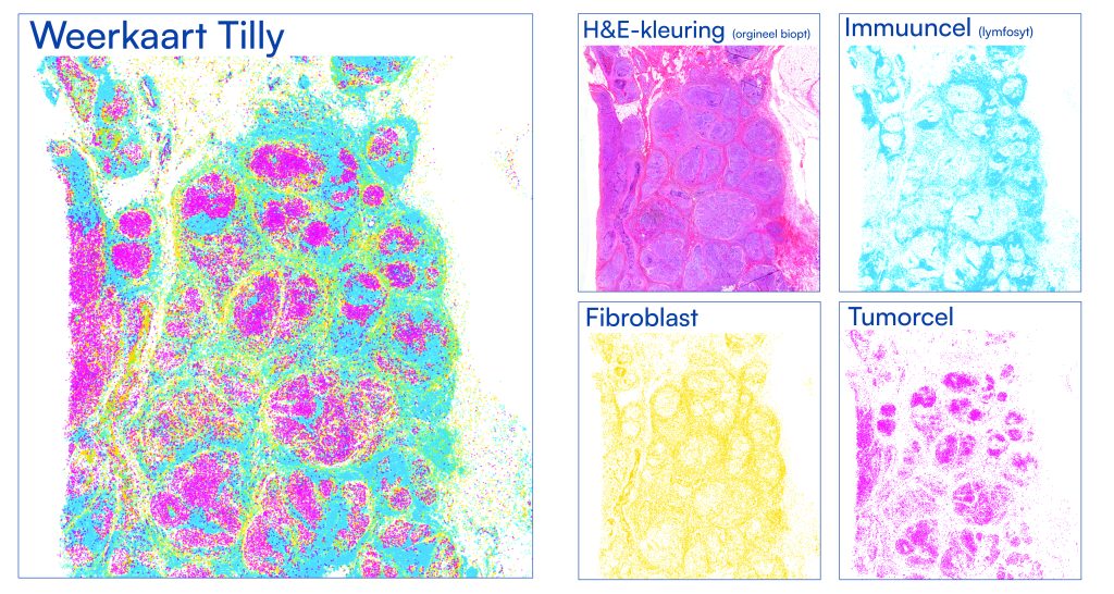 Op de bovenstaande afbeelding is algoritme getraind met ‘publieke data’ over een biopt van een patiënt gelegd. Het algoritme is getraind op het herkennen van immuun- en tumorcellen en fibroblasten en het model maakt in feite een ‘weerkaart’ van deze drie celtypen. Hierdoor wordt direct zichtbaar waar (context) en hoe vaak de drie celtypen (aantallen), immuun-, tumorcellen en fibroblasten, voorkomen. Iets wat met het blote oog door een microscoop veel lastiger is waar te nemen.